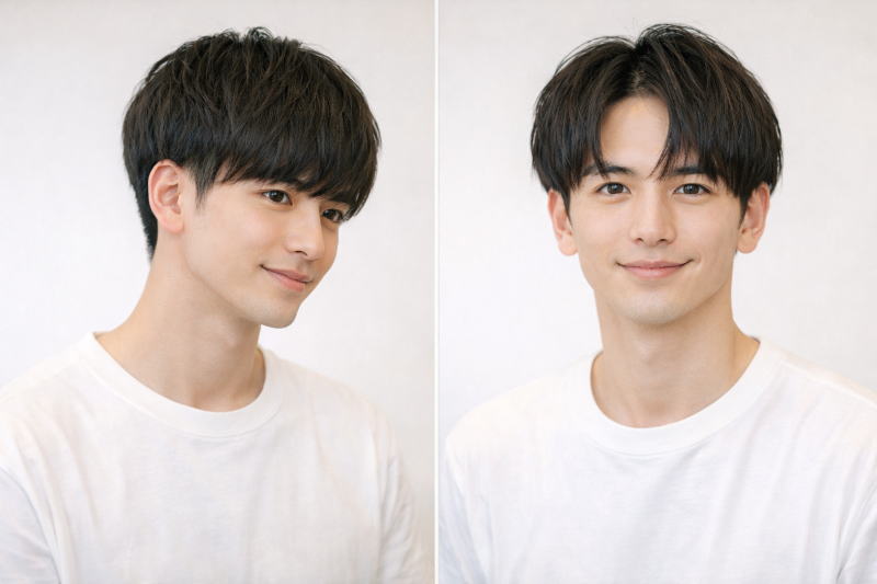 「正面」から見たときのポイントになるのは、マッシュヘアの特徴とも言える「前髪」の仕上がりになってきます。