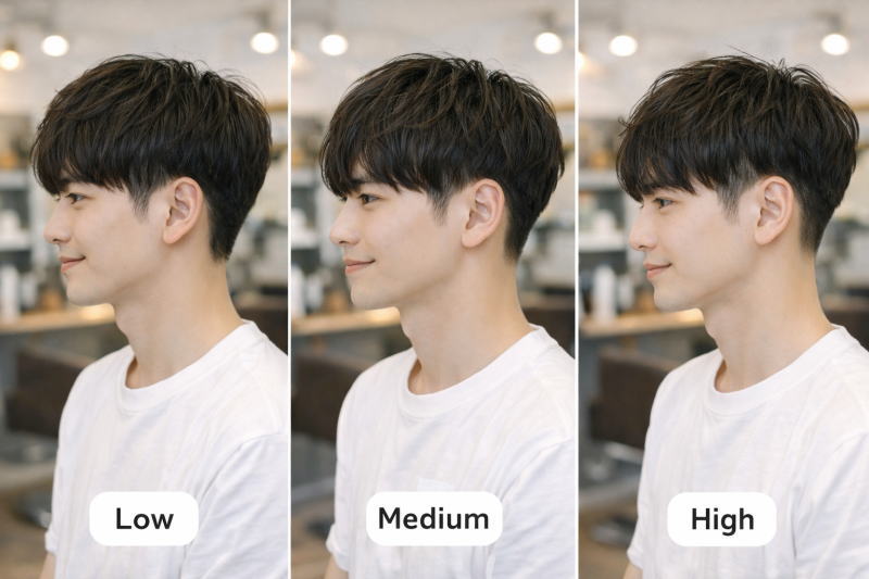 「低め(ロウ)」の優しい印象から「高め(ハイ)」の男らしい印象まで、刈り上げ部分の見せ具合いであなたのイメージもいろいろ演出できます。