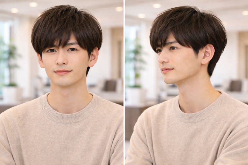 さらに、前髪にほんの少し隙間をつくることで視線が分散し、顔の余白が引き締まって見える効果も期待できます。丸みのあるフォルムを活かしながらバランスを整えれば、刈り上げないマッシュでも自然な小顔見せが実現できるでしょう。