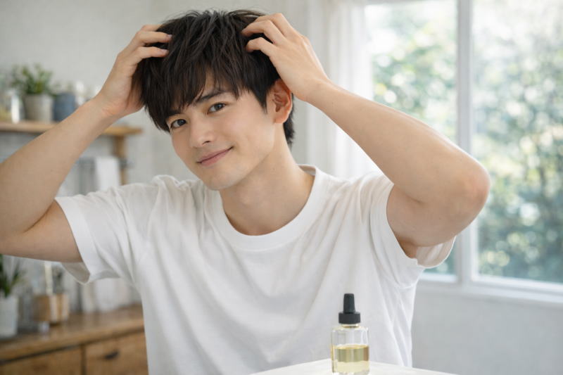 また、ヘアオイルはツヤ感を与える効果もあるため、ワックスを使わなくても清潔感のある印象を作りやすいのもポイントです。ノーセットでも自然に決まるショートマッシュを目指すメンズにとって、ヘアオイルはとても相性の良いアイテムと言えるでしょう。