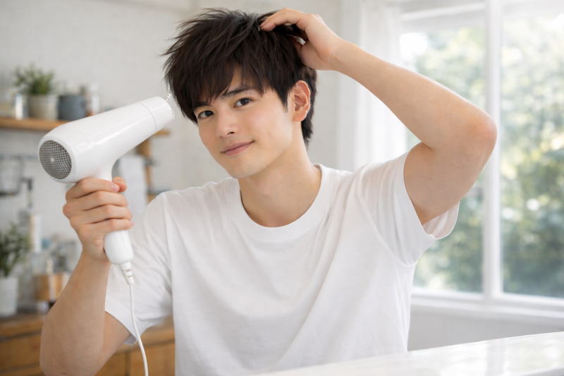 また、サイドは広がりすぎないように上から風を当ててボリュームを抑えるのがポイントです。このようにトップ・前髪・サイドのバランスを意識して乾かすことで、ワックスなしでも整ったショートマッシュを作ることができます。