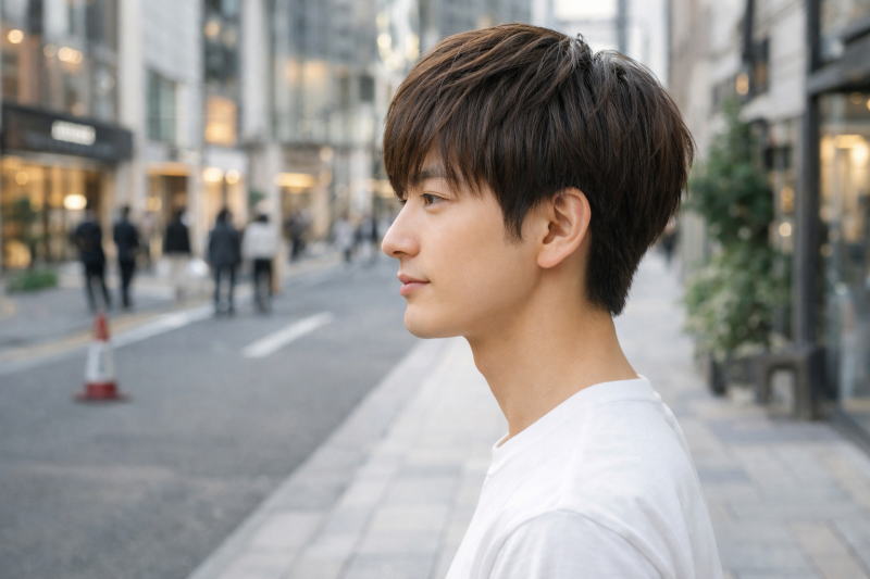 ナチュラルマッシュでノーセットでも整いやすいヘアスタイルとして、もう一つ注目されているのが「刈り上げ×前下がり」を組み合わせたマッシュスタイルです。サイドや襟足をすっきり刈り上げながら、前髪をやや長めの前下がりに仕上げることで、横から見たときのシルエットが自然なひし形バランスに整いやすくなります。