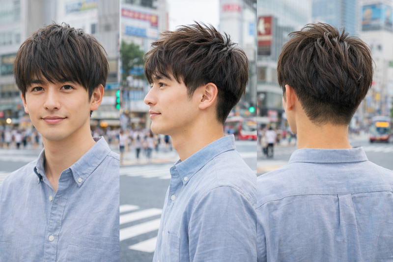 この組み合わせの爽やかなマッシュヘアでは、「前髪は長くても目の上ギリギリ」「サイドと後ろはスッキリしたショート」「トップのボリュームはやや軽め」という3つの条件を前提としています。この設定があることで、スタイリング剤を使わなくても清潔感が保ちやすくなるわけです。
